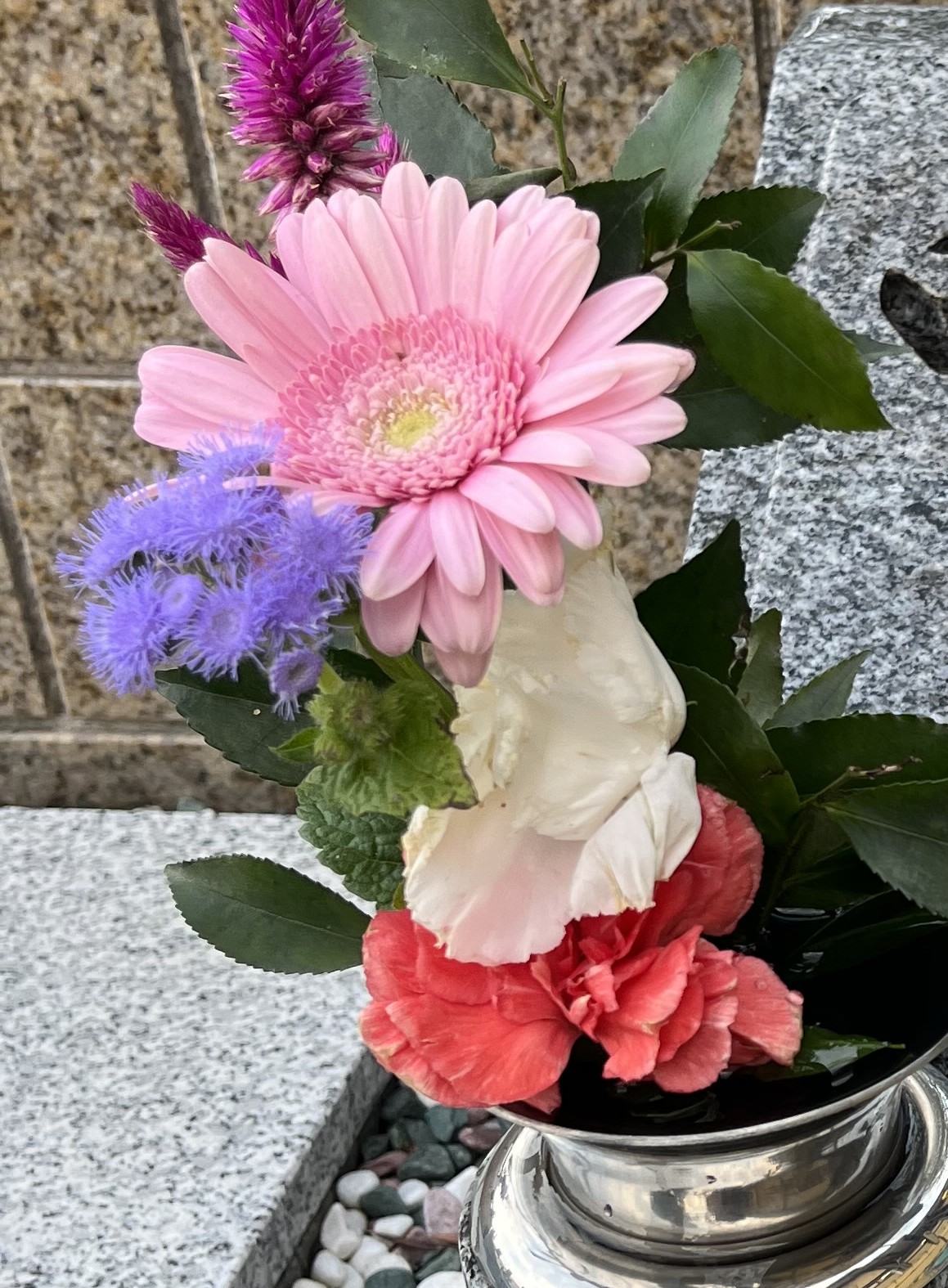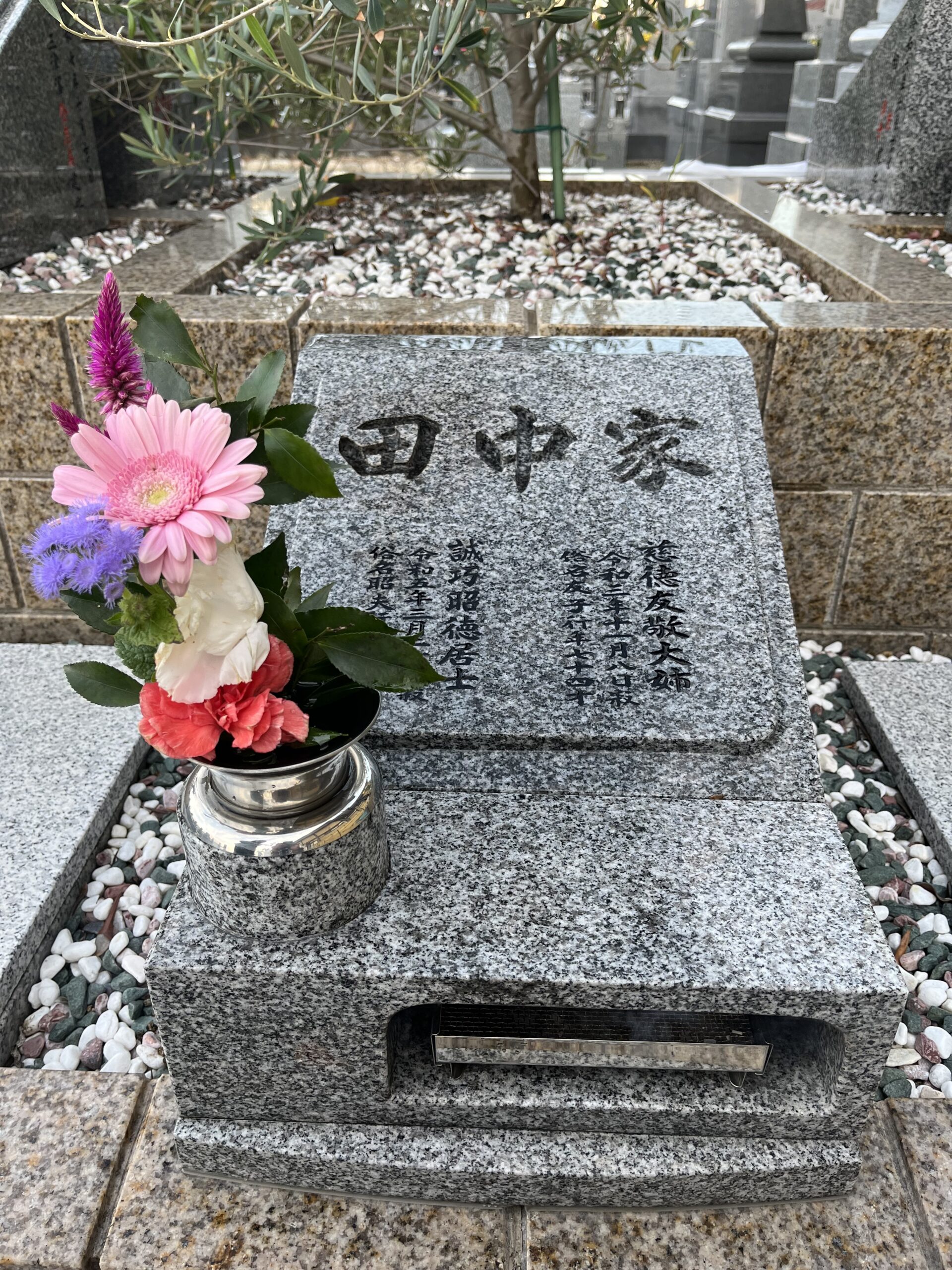 母の墓参り。誰かが花を。弟かな、友人かな、