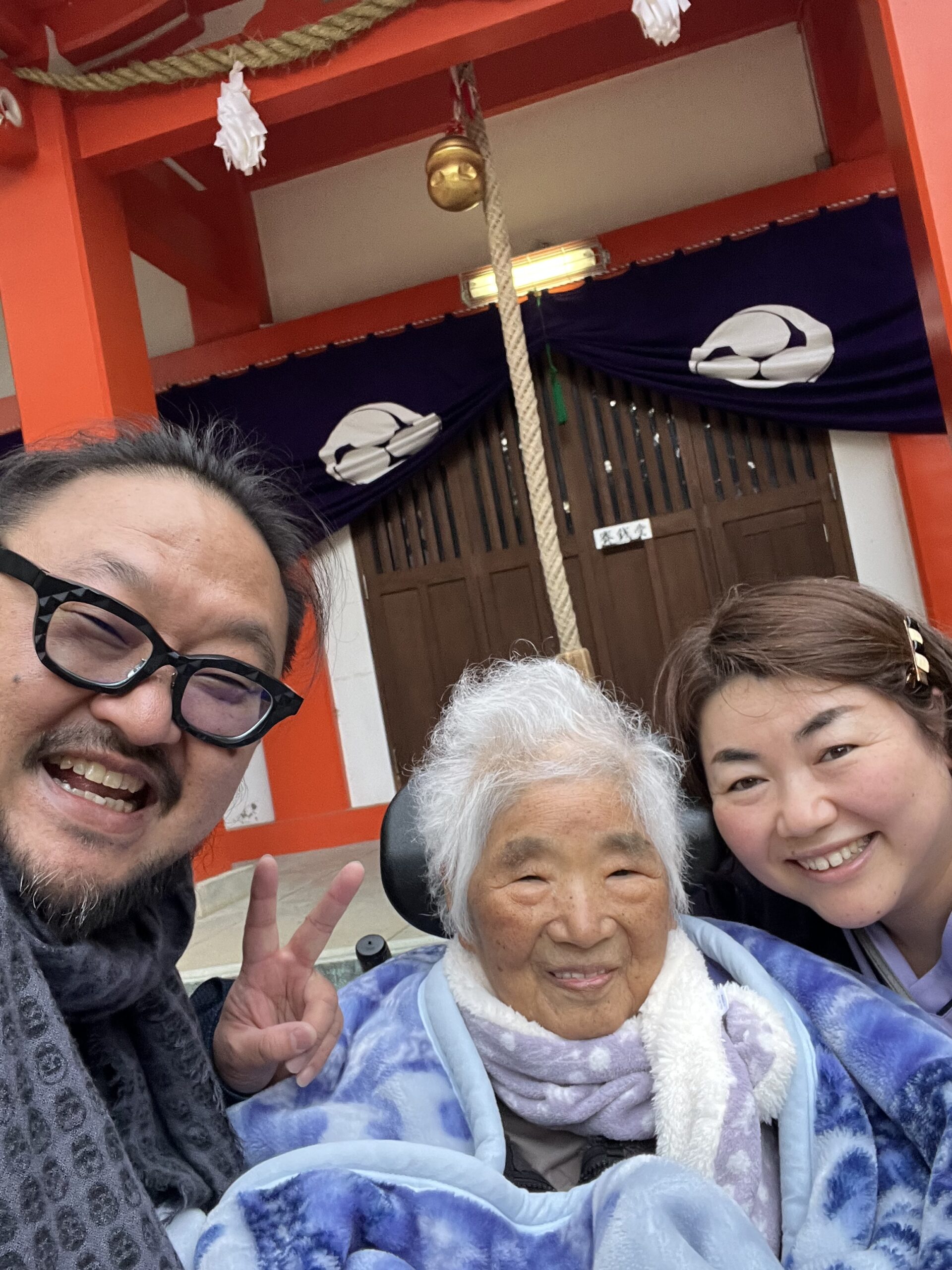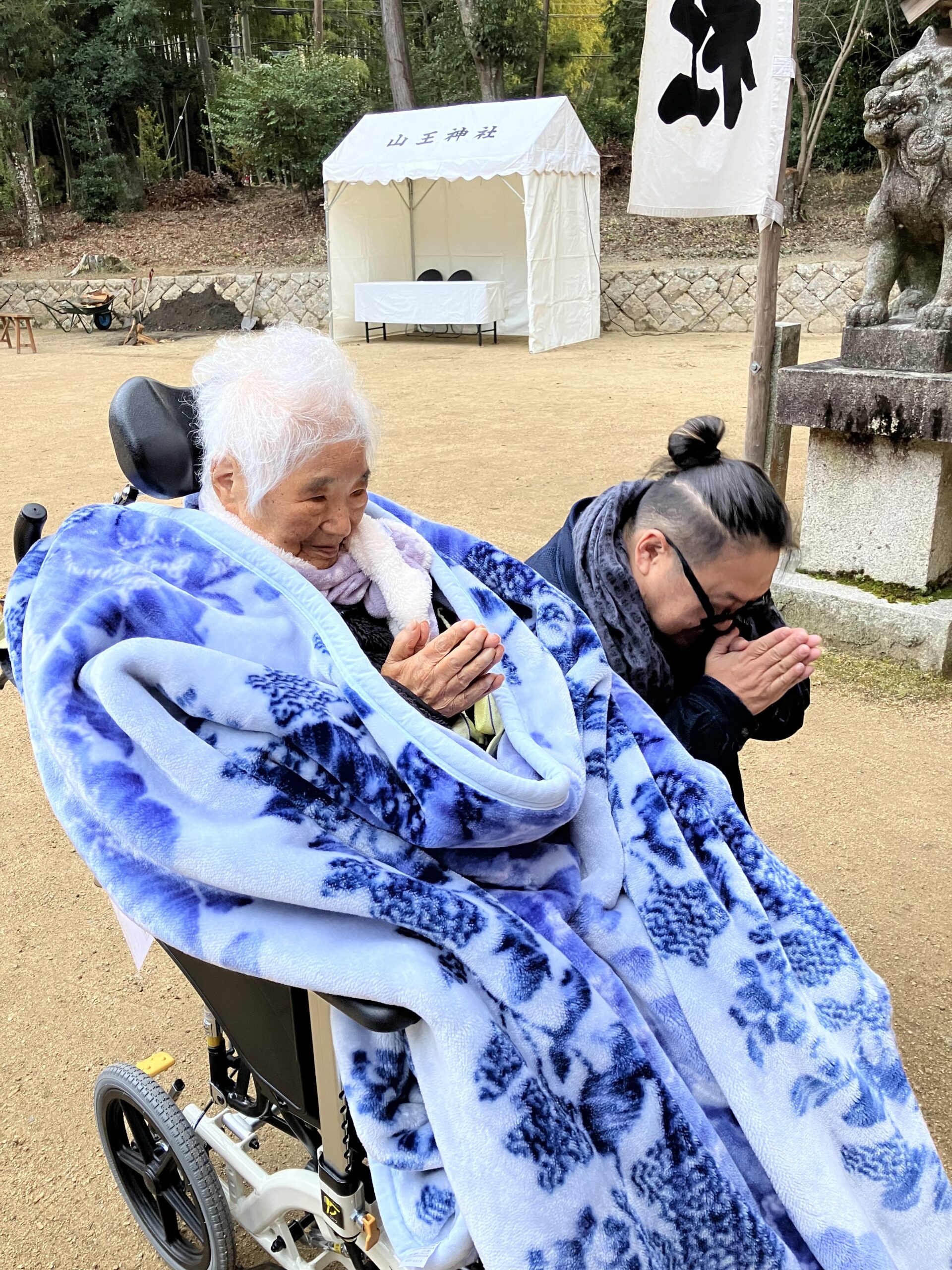 神社までティルト車椅子で毛布に包まって、
