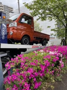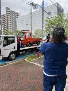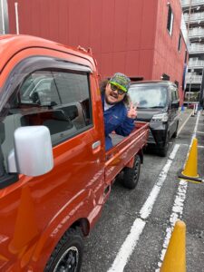 オレンジ色の中古の軽トラ、納車の日。